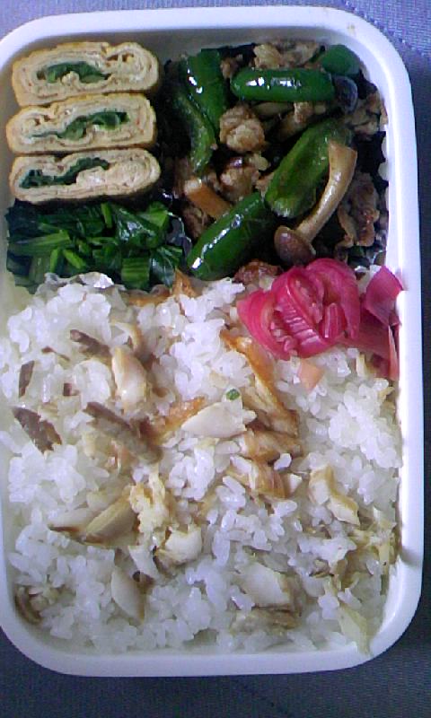 はい 今日の弁当です。 ネギ入り卵焼き シメジ・豚肉・ピーマンの炒め ほうれん草お浸し 鰺ごはん 赤がなかったので自家漬けの梅みょうが 作成時間 片付けコミで20分 最近 慣れてきて片付け込みで20分でできるようになってきた。 なかなかです~。 よかったら拍手お願いします。励みになりんす。