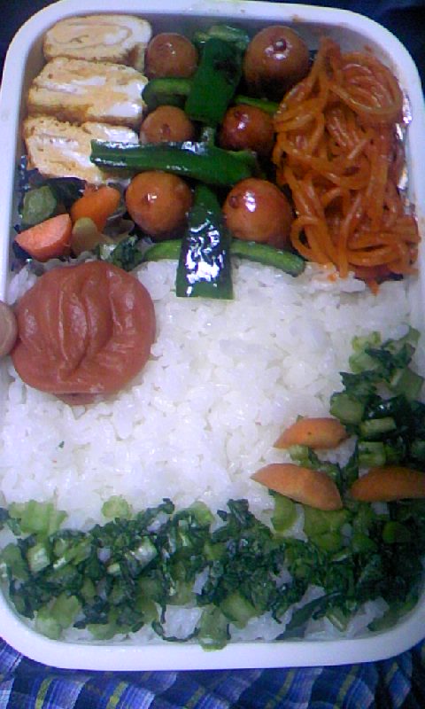 PR えらそうな事いって今週全然更新してません。 つД`)・゚・。・゚゚・*:.。 でもお弁当は作ってました。 なのでまとめてUPです。 メニューはとんちゃん焼き風卵焼き アスパラベーコン 小エビサラダ 菜メシ です。 とんちゃん焼き風は卵焼きの中に一口サイズにちぎったレタスと とろけるチーズを入れ焼いてる途中で少し醤油をたらしました。 これうまいです。 インゲンベーコン→自分でつくるもんぢゃないね。手間の割にいまいち。 菜っぱは自分でつけた一夜の大根葉です。減塩です。 さて次 テーマは昭和のおかずの弁当。 卵焼き ウィンナ ナポリタン なんも変哲のない昭和のおかずをイメージしました。 ごはんは菜っ葉飯です。 でも自分で弁当作って食べるようになってから、体調も良くなった気がする。 高血圧は大分改善されてます。 でもこの梅干しは塩分高いよwwおいしいけど。 今日 久々に外でラーメン食ったけど、ラーメンに小ライスが2か月前までは普通に喰えたけど 今日は残した。味を濃く感じたし、量も多い。 多少はこの弁当でセルフコントロールできてるのかもしれません。 お気に召したら拍手いただけると励みになります!!